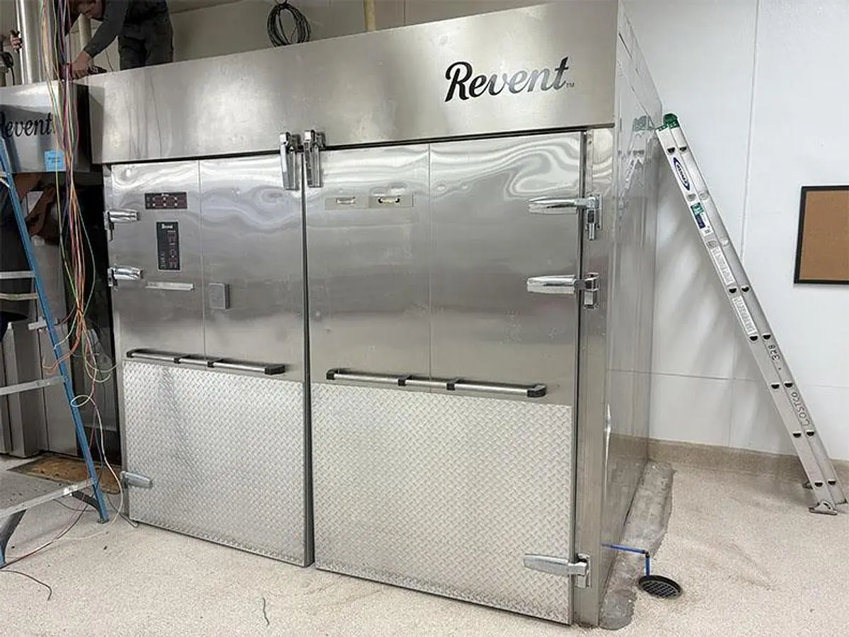 Revent 7134 Proof Box, All Stainless Steel Interior and Exterior, Aluminum Kick Plate on both doors, Self Contained Heat and Humidity Package, DOM: 2018, Overall Dimensions: 8'-10" W x 7'-1 1/2" D x 96 1/4" H, Voltage: 220 V / 3 Ph